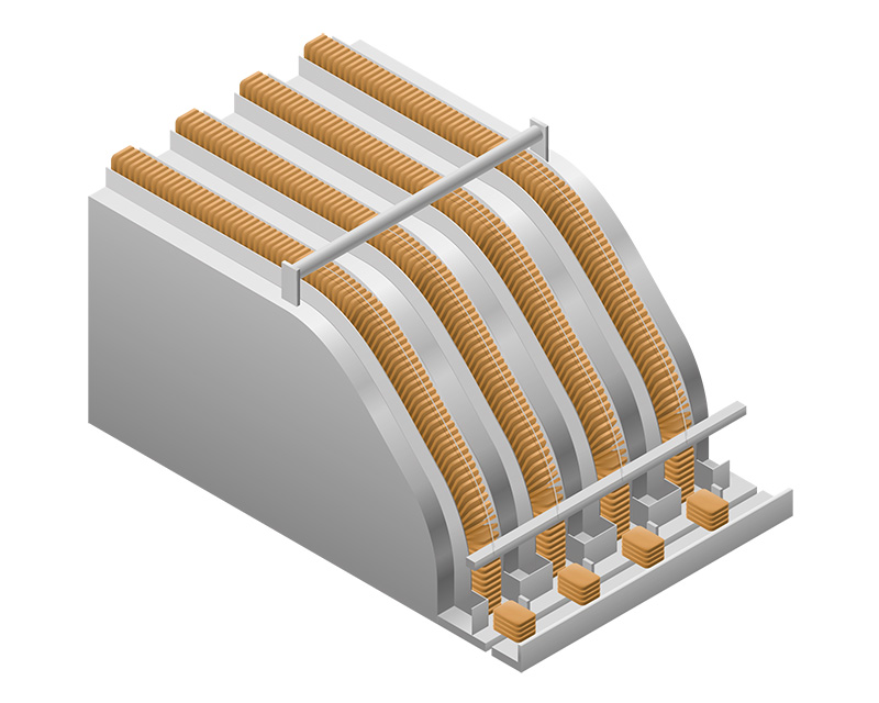 Dispositifs de stockage en amont de la flowpack de conditionnement avec des buffers horizontaux sur un ou plusieurs niveaux ou des buffers verticaux fonctionnant sur principe FIFO ou LIFO avec la possibilité de sorties multiples pour alimenter plusieurs lignes de conditionnement.