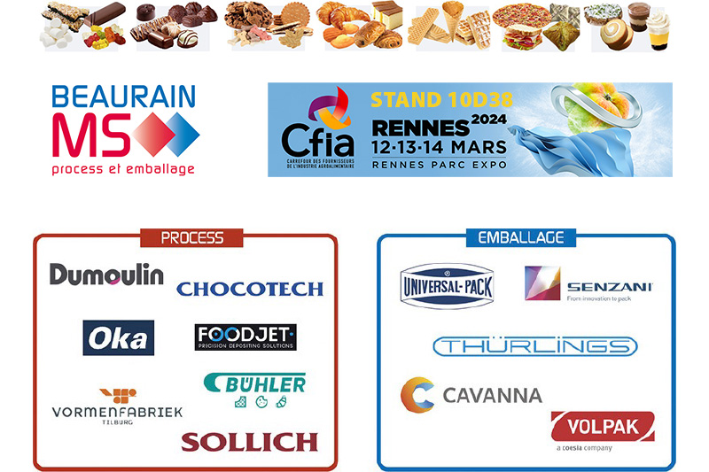 Nous avons le plaisir de vous inviter à rejoindre notre stand Beaurain MS au salon CFIA de Rennes du 12 au 14 Mars 2024 Stand D38 Hall 10. Depuis plus de 120 ans, BEAURAIN MS a été partenaire de confiance dans le domaine Agro Industriel, offrant des solutions de pointe en process et emballage pour divers secteurs, notamment la confiserie, la chocolaterie, la biscuiterie, la pâtisserie, la viennoiserie, les tartes, pizzas et produits traiteurs.